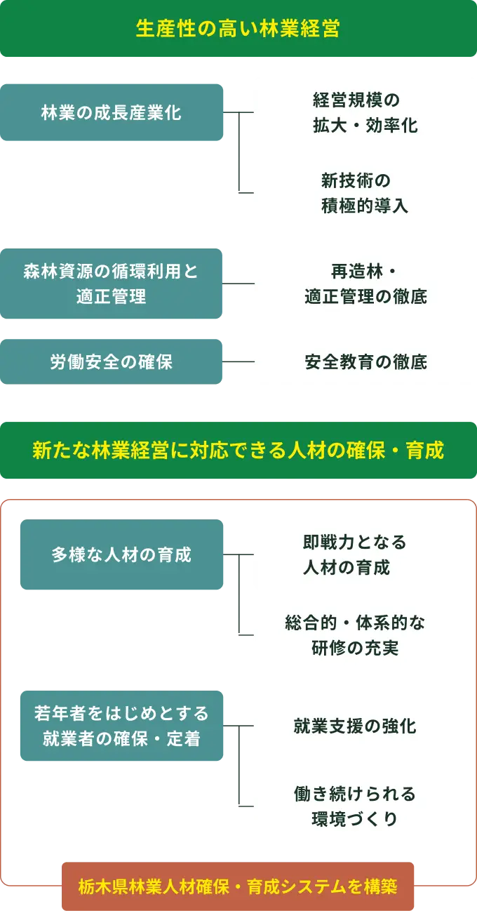 「栃木県林業人材確保・育成システム」を構築し、次の取り組みを行う
