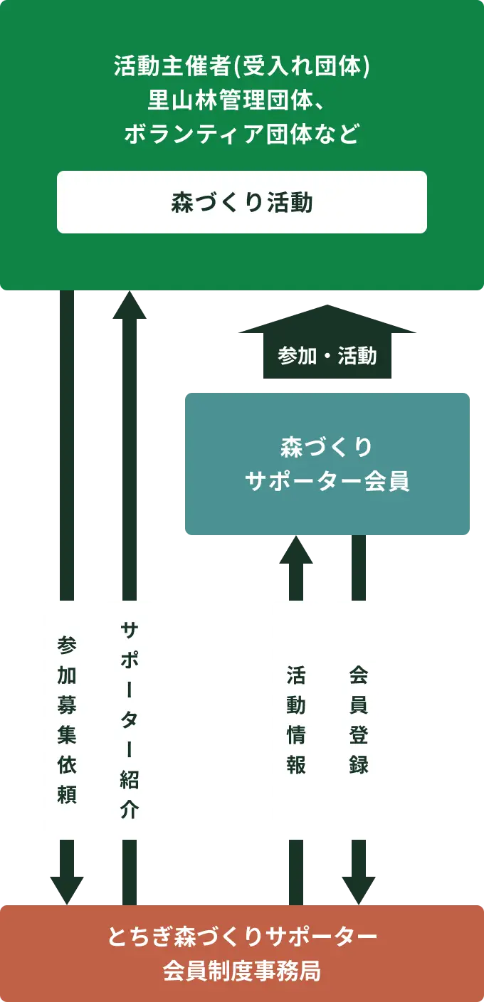 | 会員資格 | とちぎの森林、森づくりに興味のある方で、ボランティア活動に理解のある18歳以上の方 (18歳未満の方は御家族と共にお申し込みください。) |